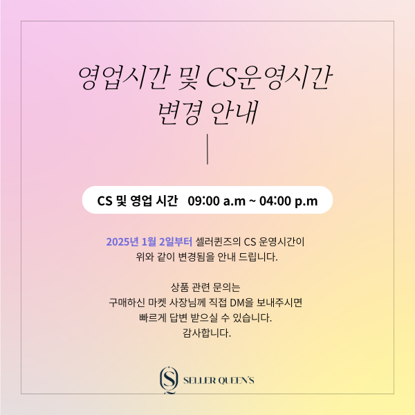셀러퀸즈 영업시간 및 CS시간이 아래와 같이 변경되오니