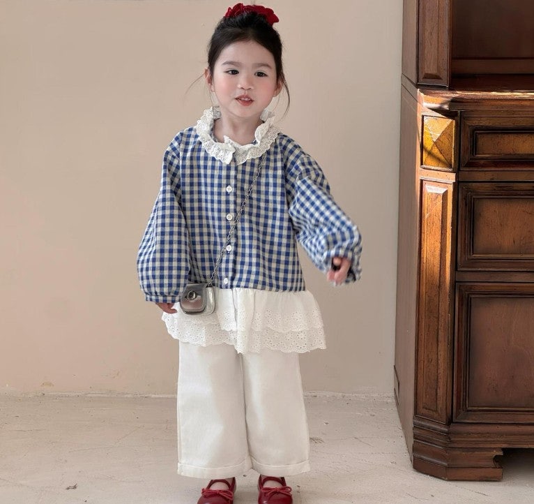 [수입]블루체크롤업팬츠셋